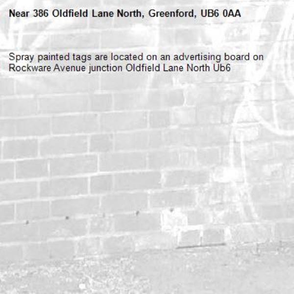 Spray painted tags are located on an advertising board on Rockware Avenue junction Oldfield Lane North Ub6