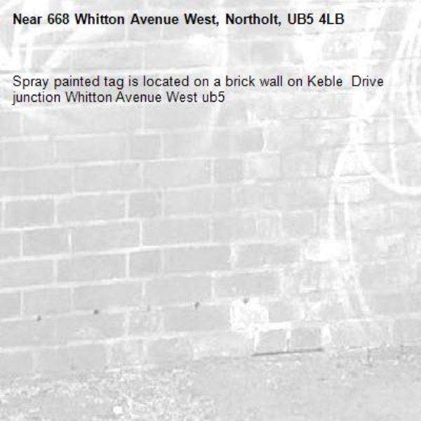 Spray painted tag is located on a brick wall on Keble Drive junction Whitton Avenue West ub5