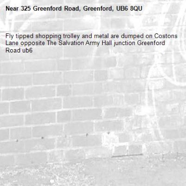 Fly tipped shopping trolley and metal are dumped on Costons Lane opposite The Salvation Army Hall junction Greenford Road ub6