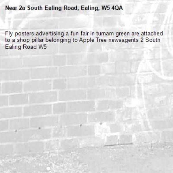 Fly posters advertising a fun fair in turnam green are attached to a shop pillar belonging to Apple Tree newsagents 2 South Ealing Road W5