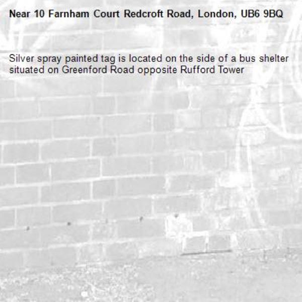 Silver spray painted tag is located on the side of a bus shelter situated on Greenford Road opposite Rufford Tower
