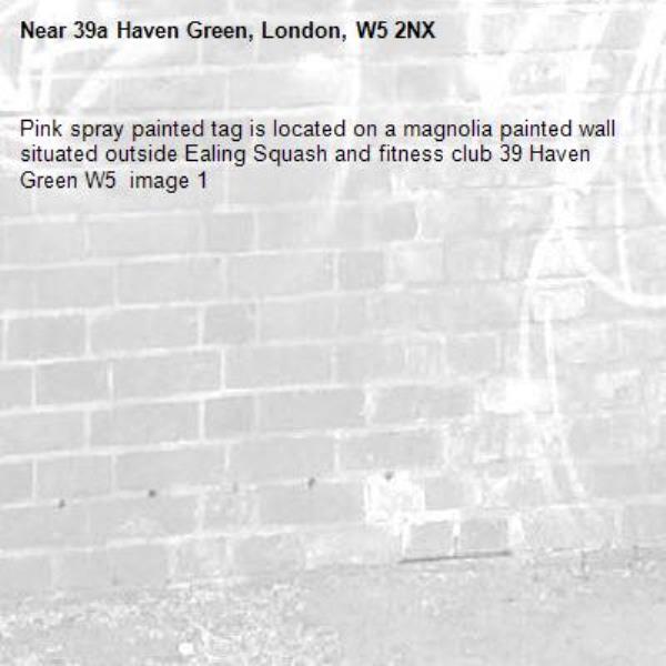 Pink spray painted tag is located on a magnolia painted wall situated outside Ealing Squash and fitness club 39 Haven Green W5