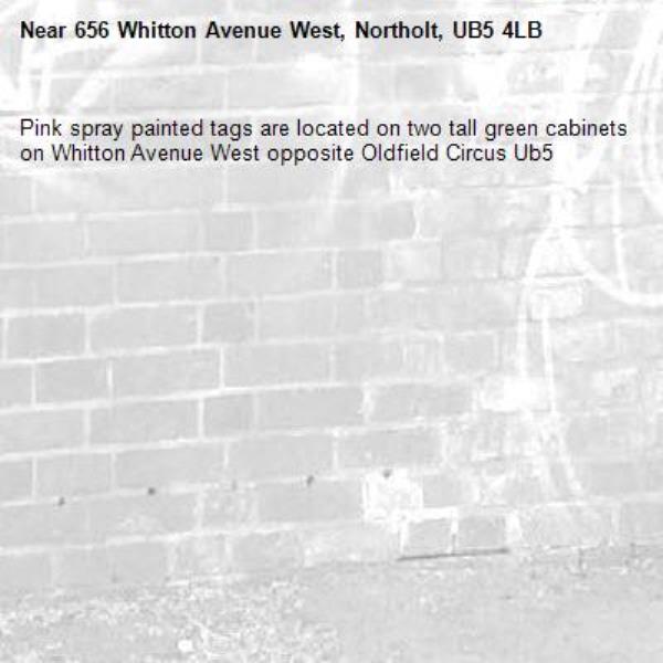 Pink spray painted tags are located on two tall green cabinets on Whitton Avenue West opposite Oldfield Circus Ub5