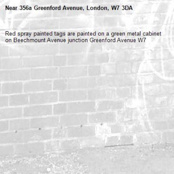 Red spray painted tags are painted on a green metal cabinet on Beechmount Avenue junction Greenford Avenue W7