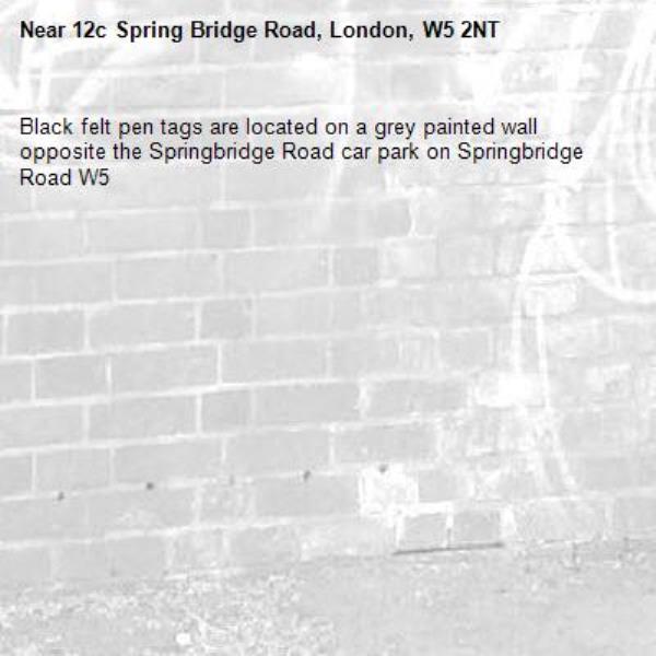 Black felt pen tags are located on a grey painted wall opposite the Springbridge Road car park on Springbridge Road W5
