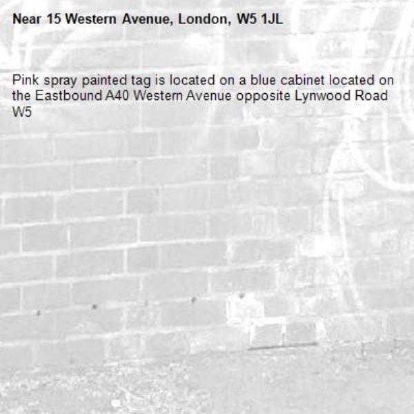 Pink spray painted tag is located on a blue cabinet located on the Eastbound A40 Western Avenue opposite Lynwood Road W5