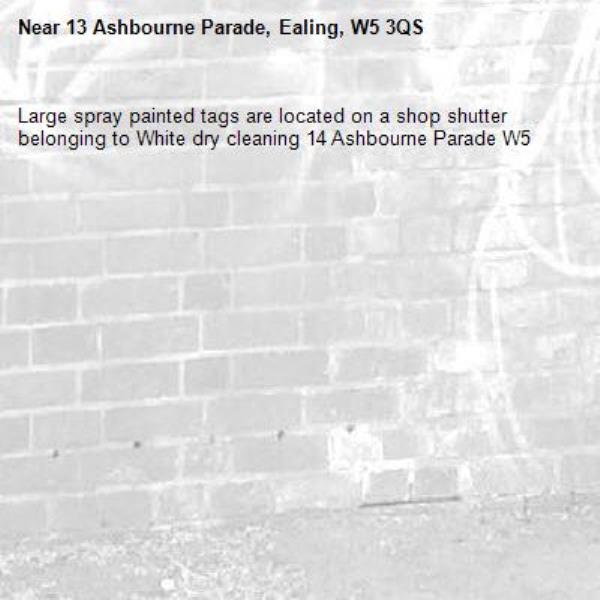Large spray painted tags are located on a shop shutter belonging to White dry cleaning 14 Ashbourne Parade W5