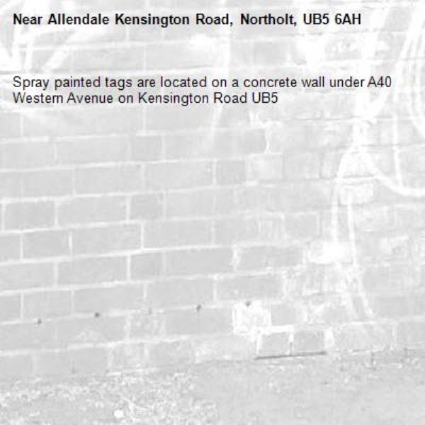 Spray painted tags are located on a concrete wall under A40 Western Avenue on Kensington Road UB5