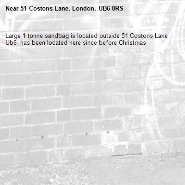 Large 1 tonne sandbag is located outside 51 Costons Lane Ub6- has been located here since before Christmas