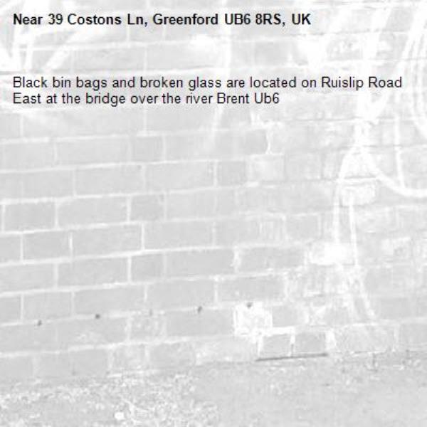 Black bin bags and broken glass are located on Ruislip Road East at the bridge over the river Brent Ub6