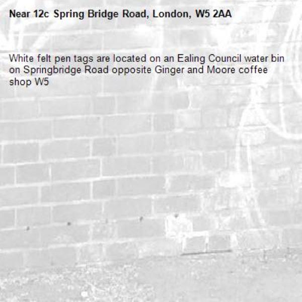 White felt pen tags are located on an Ealing Council water bin on Springbridge Road opposite Ginger and Moore coffee shop W5
