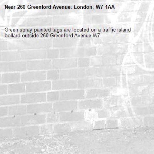 Green spray painted tags are located on a traffic island bollard outside 260 Greenford Avenue W7